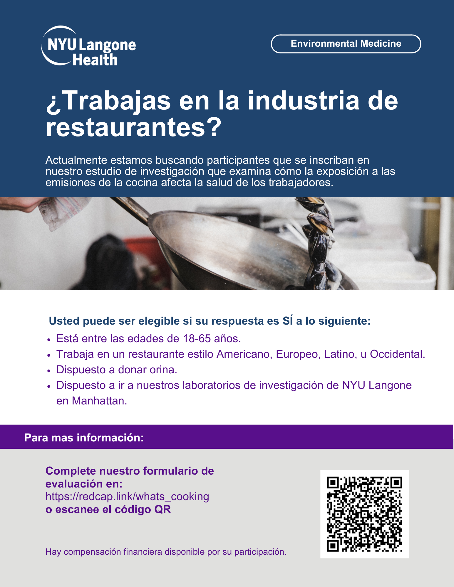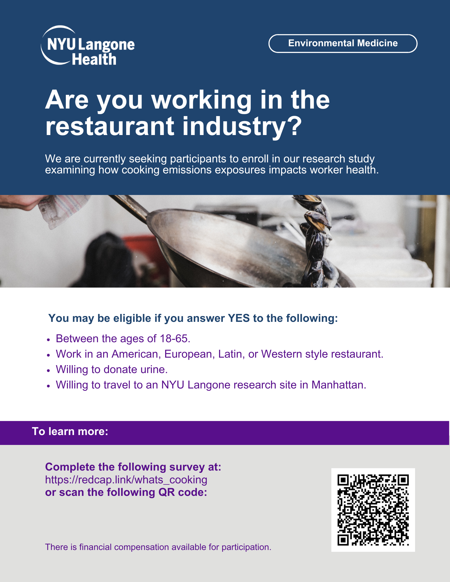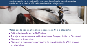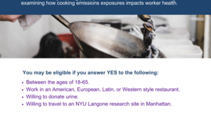 We are currently seeking NYC-based participants to enroll in our RESEARCH STUDY. This study will examine how cooking emissions exposures in a western style restaurant impacts worker health.