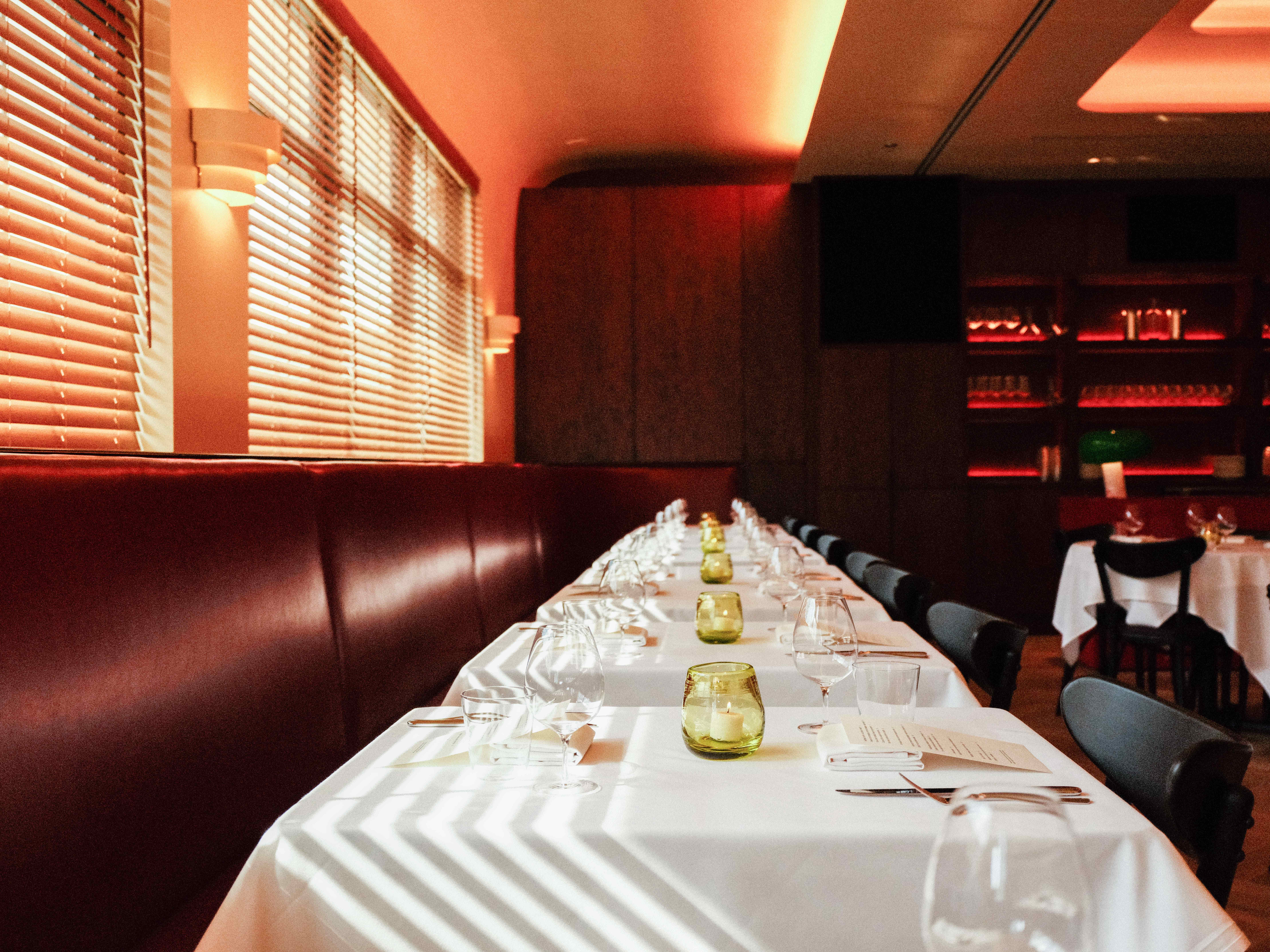 The space is intimate — about 50 seats, including the bar — designed with lacquered wood, parquet floors, deep red leather banquettes, hi-fi sound, and soft lighting. It's warm, elegant, and just a bit offbeat.