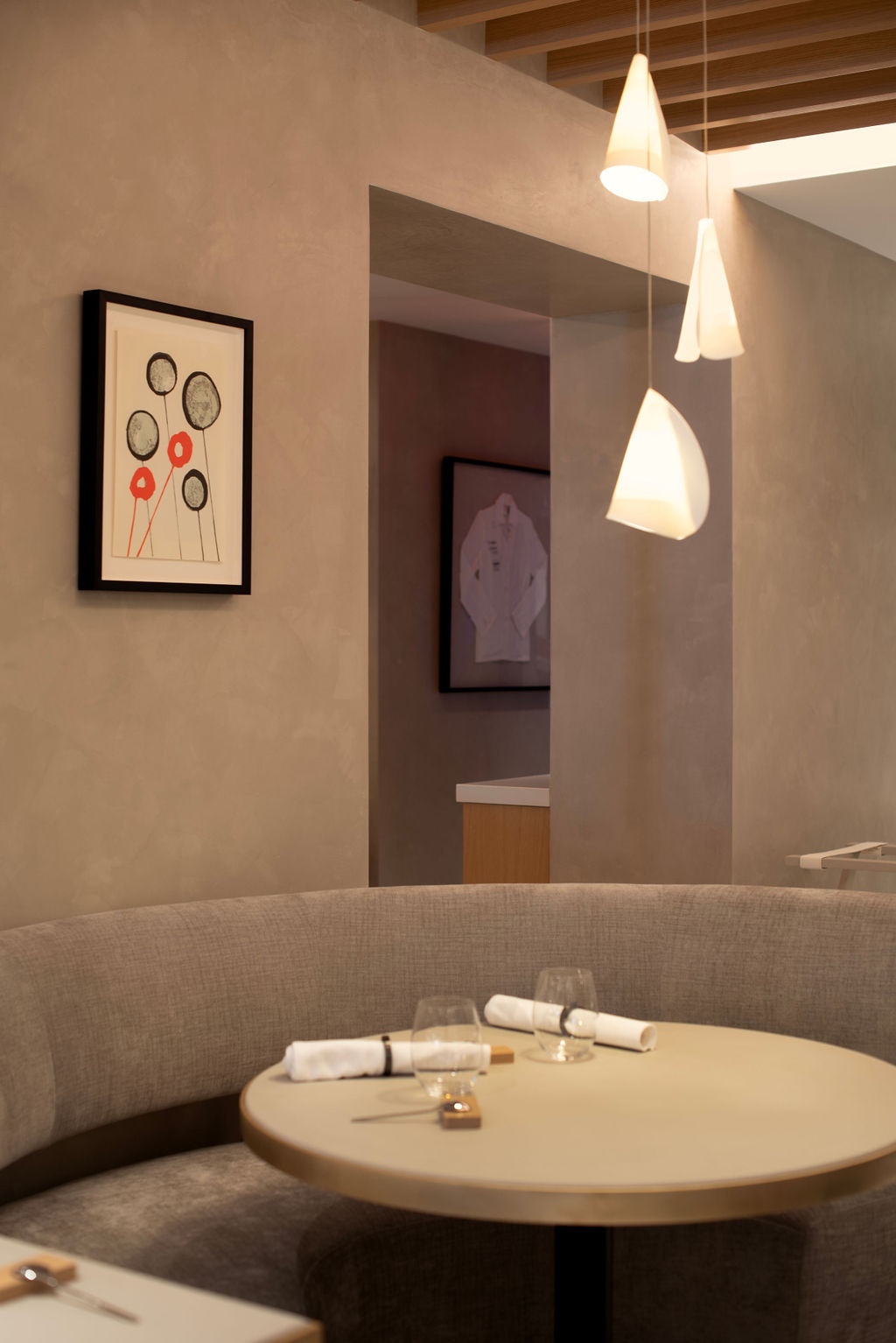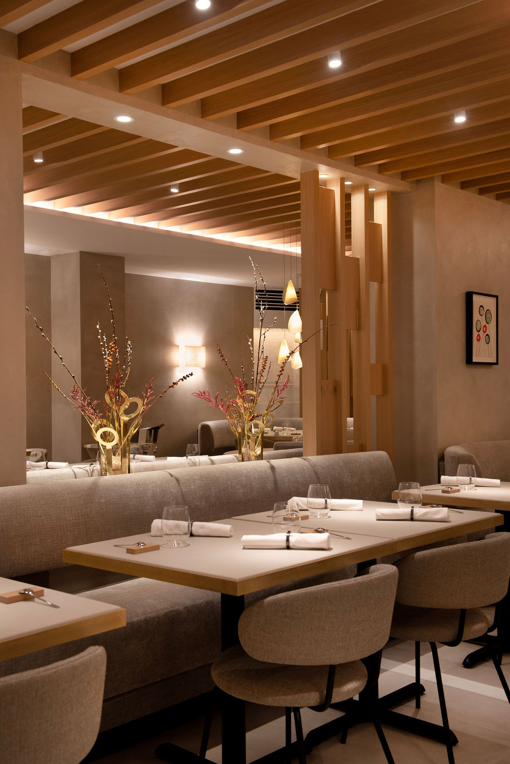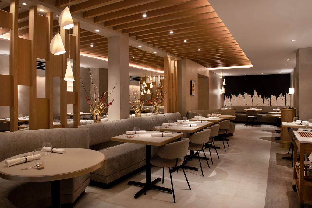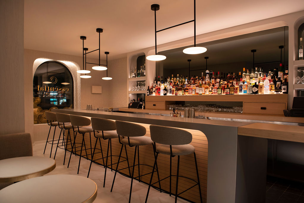 Designed by Bellanca in collaboration with prominent Parisian residential designer Caroline Egasse, Essential includes exposed wooden beams to bring height, warmth and dimension to the nearly 100-seat dining room, and leather, brass and delicate touches of Élitis wallpaper and porcelain tile to lend texture and a subtle edge.